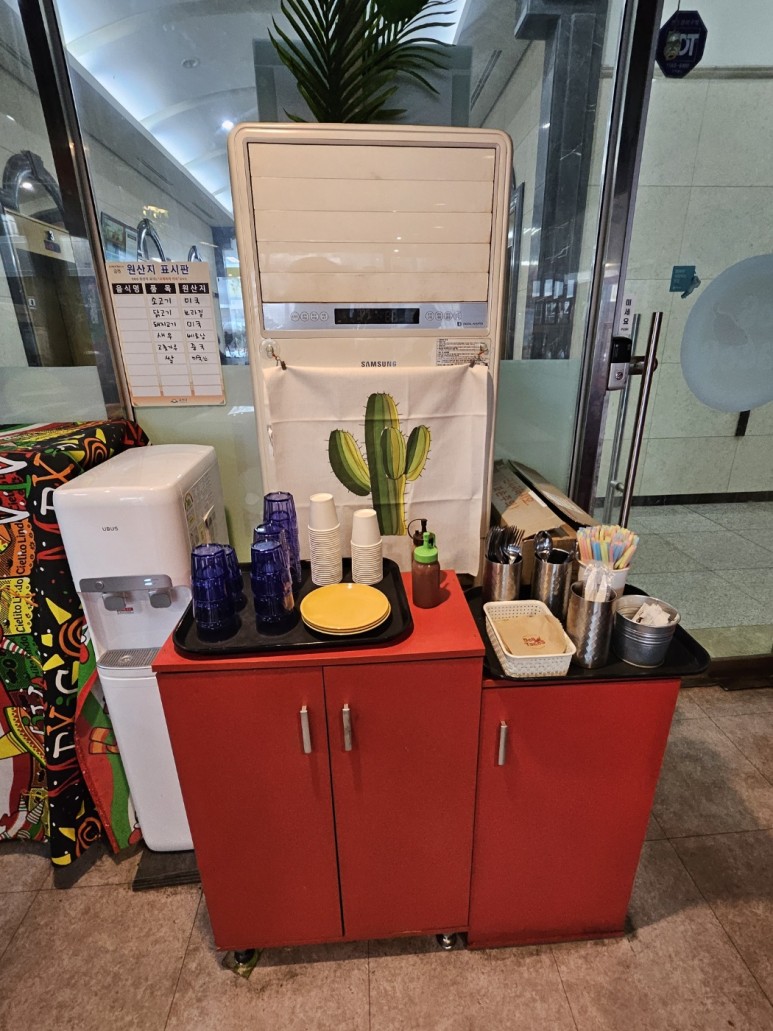 물, 접시, 수저, 냅킨 등은 셀프 소스도 소스통에 담겨져 있어 필요하면 가져다 먹을 수 있다.