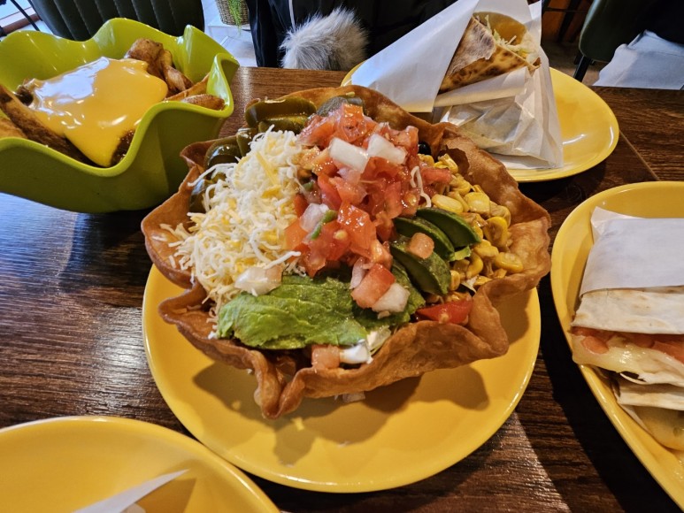 이렇게 주문하면 브리또4개, 케사디아4개, 샐러드, 감자치즈 가 아주 푸~짐하게 준비된다.